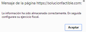 Finalizada la configuración, de click en "Guardar" para resguardar todos los cambios efectuados y el sistema le mostrará el mensaje: "La información ha sido almacenada correctamente. Enseguida configurará su ejercicio fiscal."