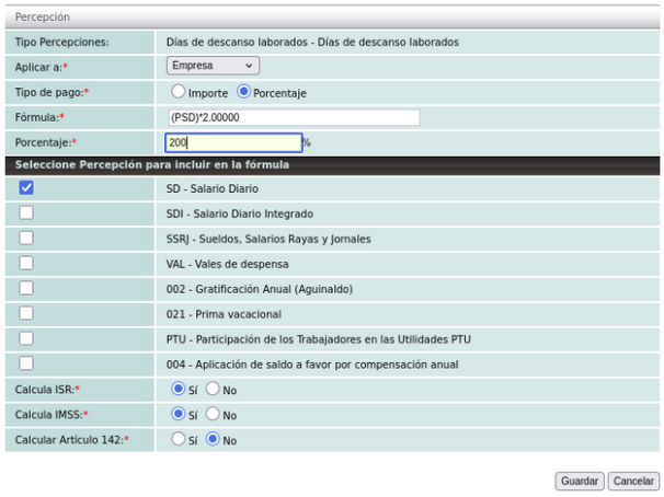 Una vez agregada la percepción es necesario realizar la configuración de la fórmula en la cual se realizará el cálculo.