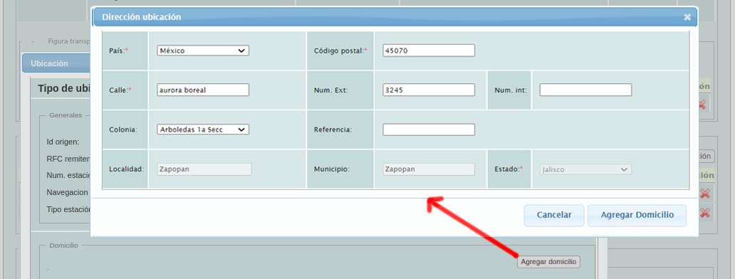 Es obligatorio agregar un domicilio, los campos requeridos son: País, Calle, Colonia y Código postal; al introducir el código postal, la plataforma de SF le proporcionará los datos de la Localidad, el Municipio y el Estado de la dirección de manera automática.