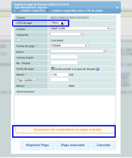 In the "CFDI de pago" field, choose the series you previously configured for payment e-document. If you haven't configured one, see lesson ID-106.5.2. for details.