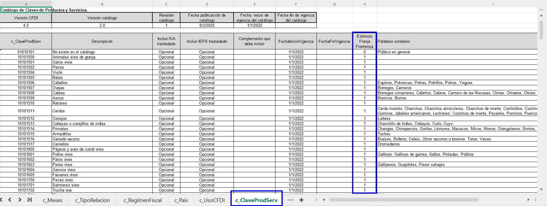 Diríjase a la hoja c_ClaveProdServ. La 8° columna llamada "Estímulo Franja Fronteriza" marcará con un 1 si el producto/servicio SÍ aplica para el estímulo fiscal. Se marcará con un 0 si el producto/servicio NO aplica para el estímulo fiscal.