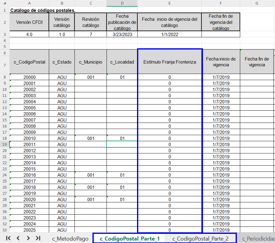 Hay 2 hojas de códigos postales para cubrir todos los códigos postales del país: c_CodigoPostal_Parte_1 y c_CodigoPostal_Parte_2.