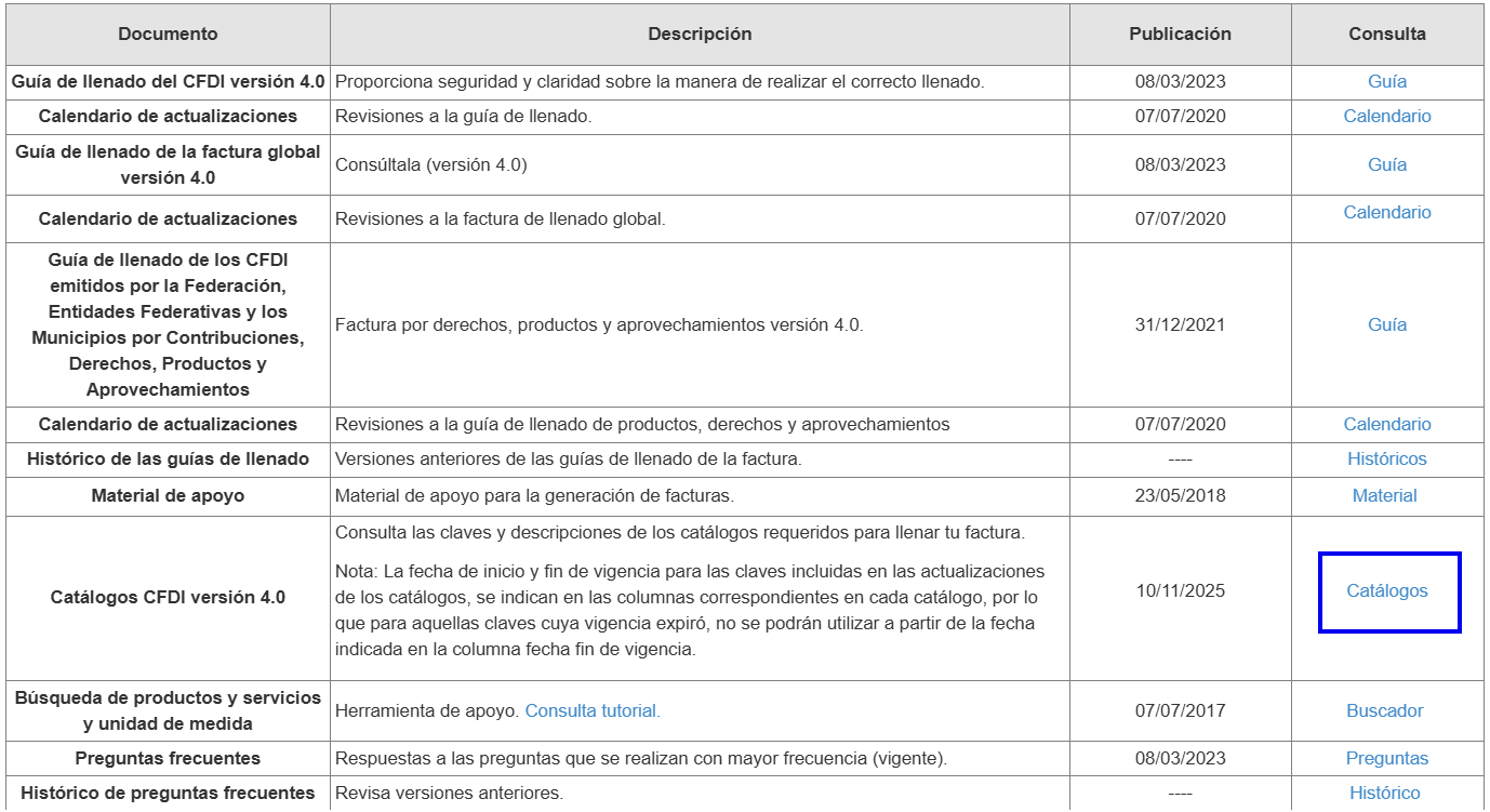 Diríjase a la página del SAT del anexo 20 . En la tabla de documentos debajo del texto "Aquí encontrarás información necesaria para emitirla en la versión 4.0 del Anexo 20". Descargue los "Catálogos" dando click en la 4° columna (archivo de excel).