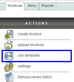 In the "Invoicing" module, click on the "use template" action in the "Actions" menu.