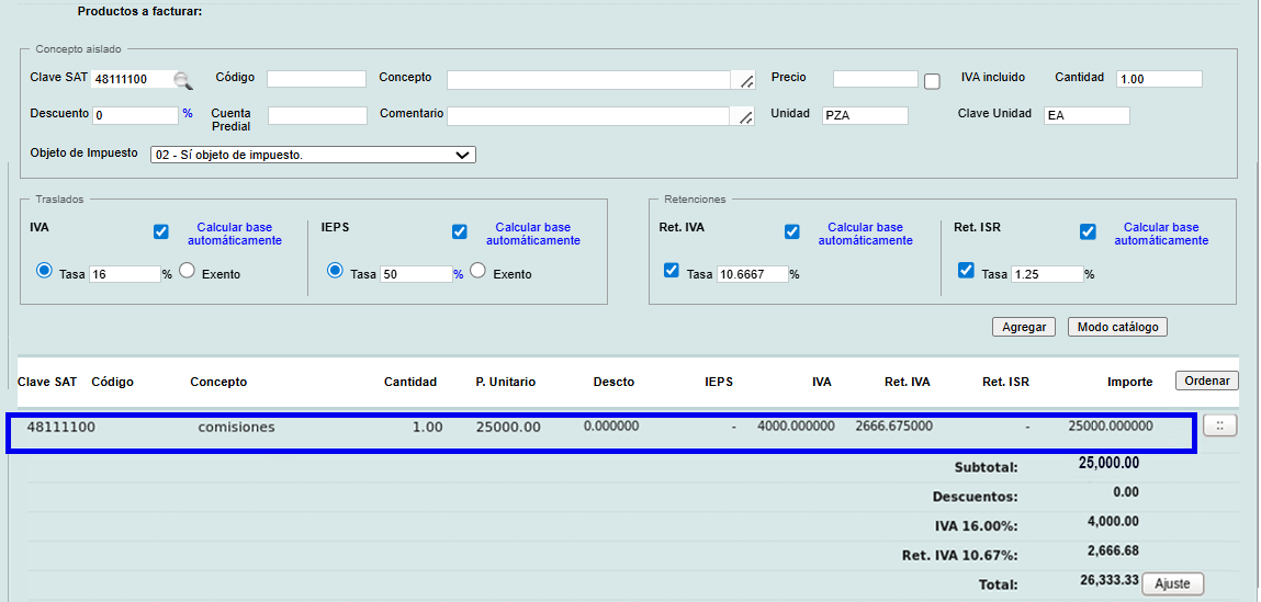 Go to the "Productos a facturar" section to register at least one item, price, and quantity.