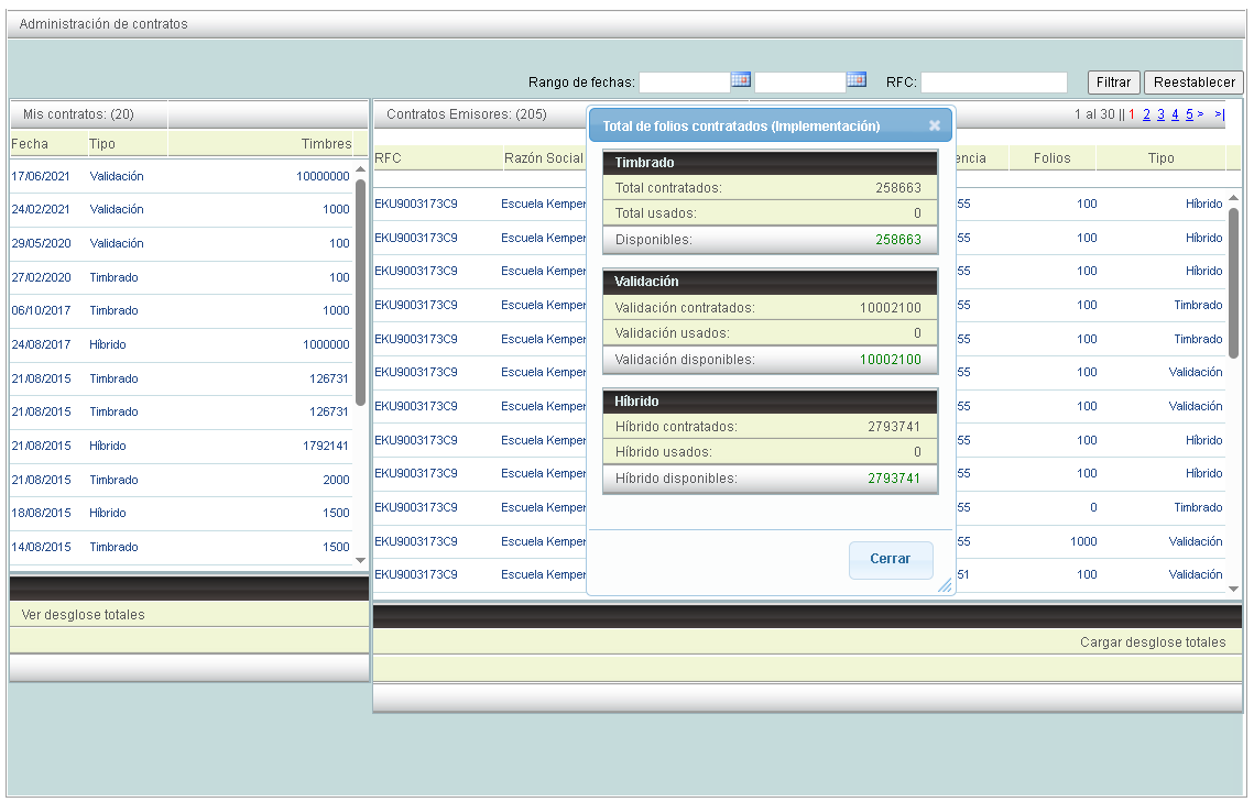 The contracts for each issuer will be displayed, and in the lower left corner click on "Ver desglose totales" and in the window you can see the total number of contracted, used, and available stamps.