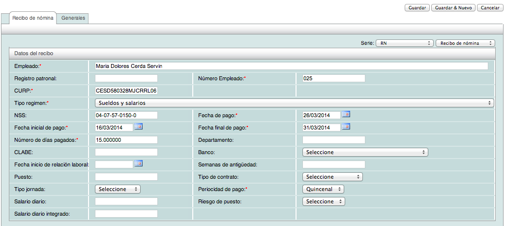 Para iniciar con la creación del recibo seleccione al empleado previamente registrado en el sistema, en seguida ingrese la información que se le solicita.